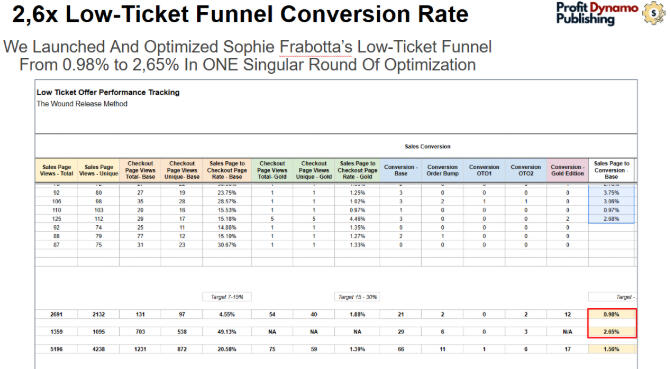 We had initially given Sophie Frabotta a consult and built her a low-ticket funnel. It started off at 1% CVR, and with just one round of optimization we bumped it up by 2,6x.
